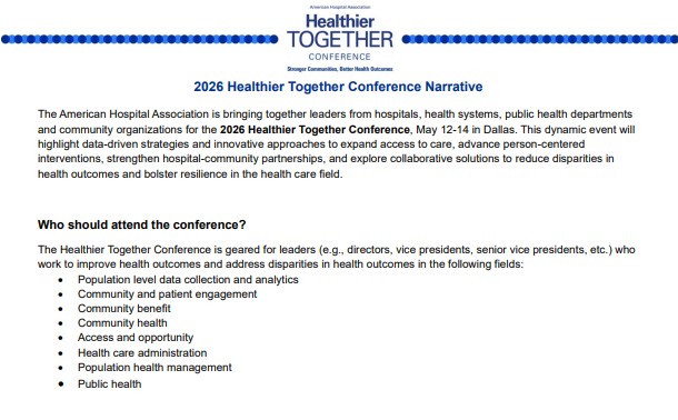 - The American Hospital Association’s new Healthier Together Conference will highlight data-driven strategies and innovative approaches to help build stronger communities and drive better health outcomes. Learn more about this convening, taking place May 12-14, 2026, in Dallas, by visiting https://healthiertogether.aha.org #HealthierTogether #CommunityHealth #PopulationHealth